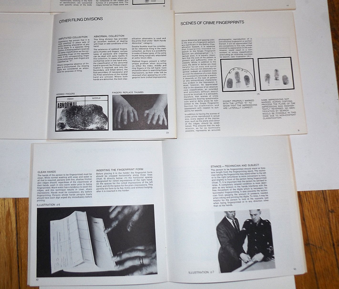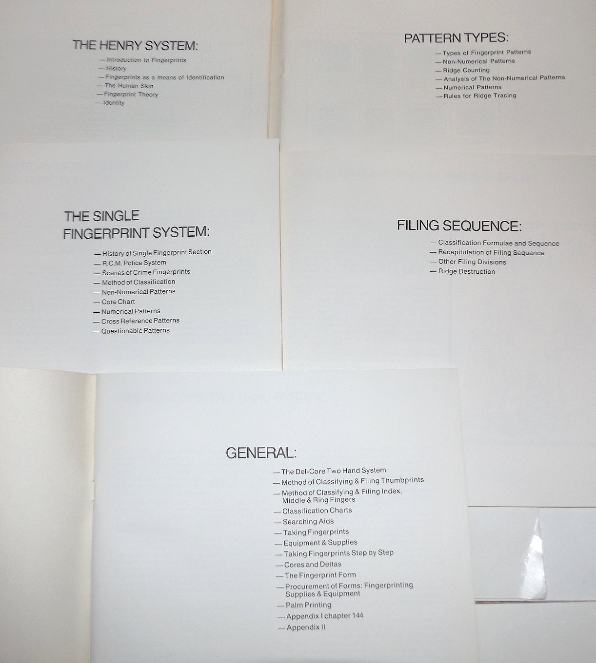31, 51, 31, 59, and 67 pages. With illustrations.8vo., size 10" x 10",From the foreword: “This series of texts outlines the methods and systems employed by the Royal Canadian Mounted Police Identification Services in classifying, filing, and searching fingerprints. These updated publications culminate all the techniques and improvement resulting from many years of experience.”01786View Full Details