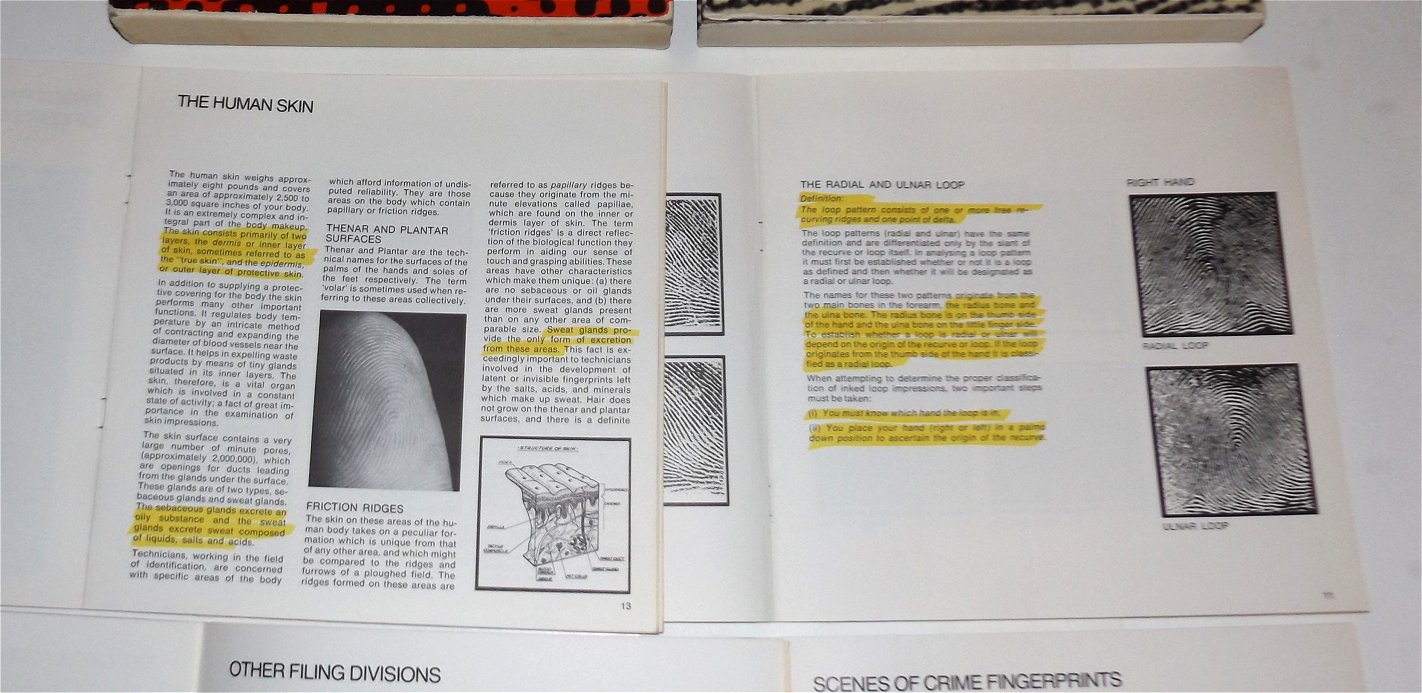 138 pages with photos.Softcover sbook, size is 5 1/2" x 8 1/2".The author's experiences "Fighting with the 1st Battalion 5th (MECH) Infantry in Vietnam". Signed by the author.01787View Full Details - FINGERPRINTS. A NATIONAL POLICE SERVICE. 1) The Henry System; 2) Pattern Types; 3) Filing Sequence; 4) The Single Fingerprint System; 5) General. Ottawa Royal Canadian Mounted Police no date (circa 1973)145.00The first 2 volumes have highlighting in yellow throughout, annotation in pen on front cover of volume 1, otherwise all the volumes are in near fine condition. The inner slipcase has some wear, 4” split along the bottom, the outer slipcase has wear, a scrap on the front with paper loose.