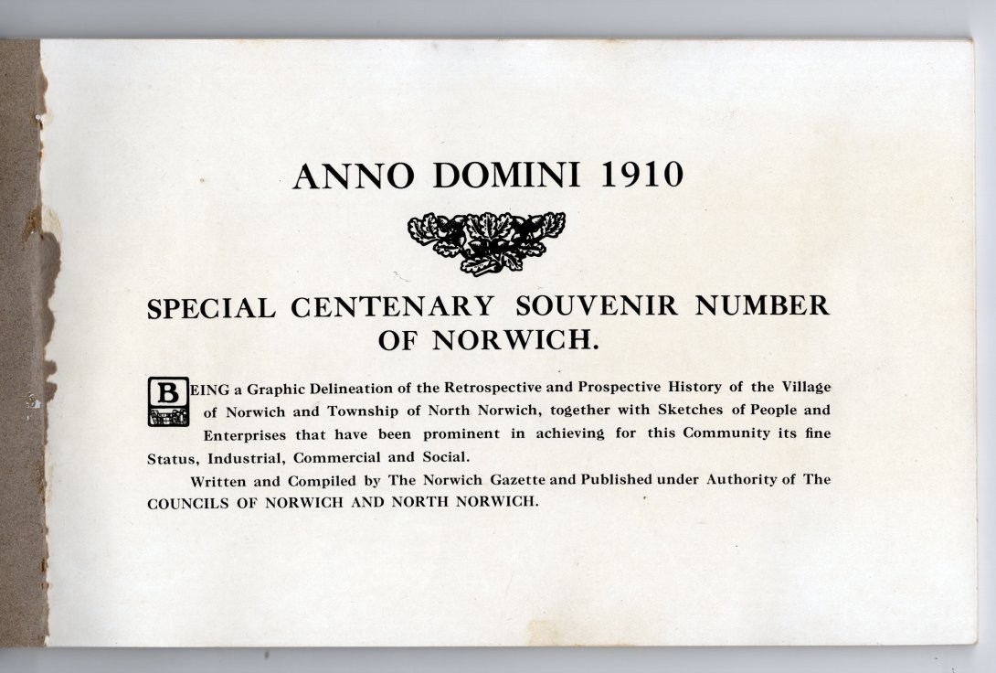 The five books are titled: 1) The Henry System; 2) Pattern Types; 3) Filing Sequence; 4) The Single Fingerprint System; 5) General. - Anno Domini 1910 Special Centenary Souvenir Number Of Norwich (Cover Title: 1810-1910 Centenary Souvenir Norwich, Ont) (Norwich, ON) The Norwich Gazette, 1910100.00Condition for this softcover book is good+ with most of the spine worn away (see photo), small hole front cover, slight edge wear.