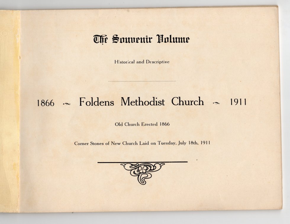 A one-of-a-kind signed program! - THE SOUVENIR VOLUME HISTORICAL AND DESCRIPTIVE 1866 - FOLDENS METHODIST CHURCH - 1911 No place no publisher 191185.00Condition for this softcover book is good+ with most of the spine worn away (see photo), a couple small tears along the edges of the front cover, some smudging to covers, slight edge wear, interior clean.