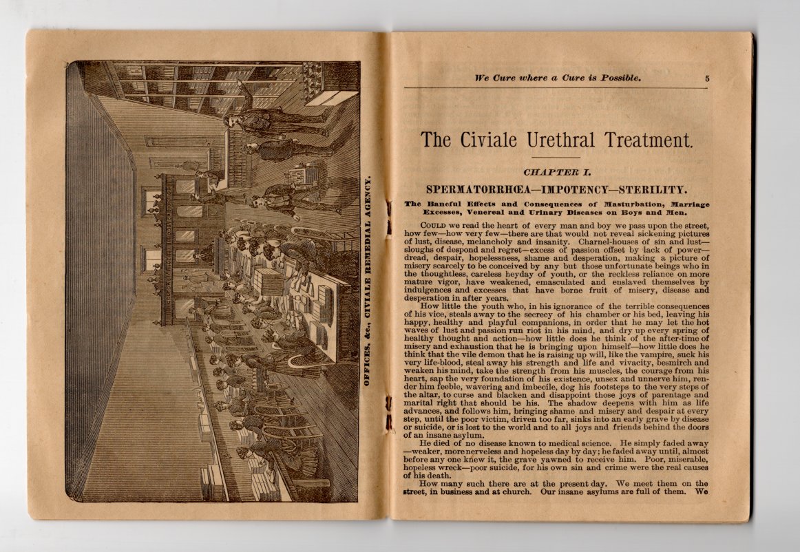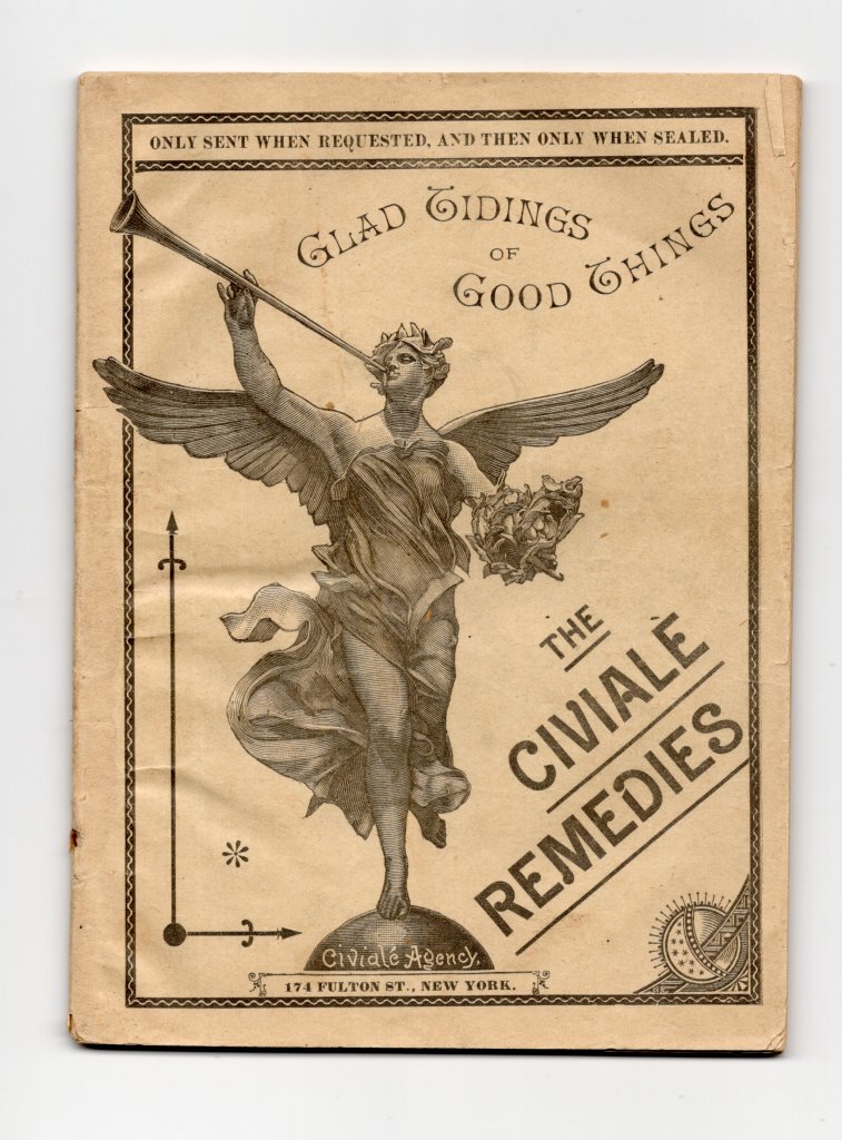 96 pages with illustrations throughout.Softcover, size is 9” x 11 ½”.More than just a catalogue there are sections on the life and times of the inventor of the incubator and numerous full-page articles on farm life, fake chicken literature, advertising, when to sell, raising chicken and much, much more. A fascinating catalogue.01796View Full Details - MANHOOD PERFECTLY RESTORED. PROF. JEAN CIVIALE'S SOLUBALE URETHRAL CRAYONS, AS A QUICK, PAINLESS AND CERTAIN CURE FOR IMPOTENCE, LOST MANHOOD, SPERMATTORRHOEA, LOSSES, WEAKNESS AND NERVOUS DEBILITY. ALSO FOR PROSTATITIS AND VARICOCELE New York The Civiale Remedial Agency 1885200.00"Sixth Edition, Enlarged, Revised and Illustrated."Condition is about very good with some edge wear, some wear to corners, light soiling to wrappers.