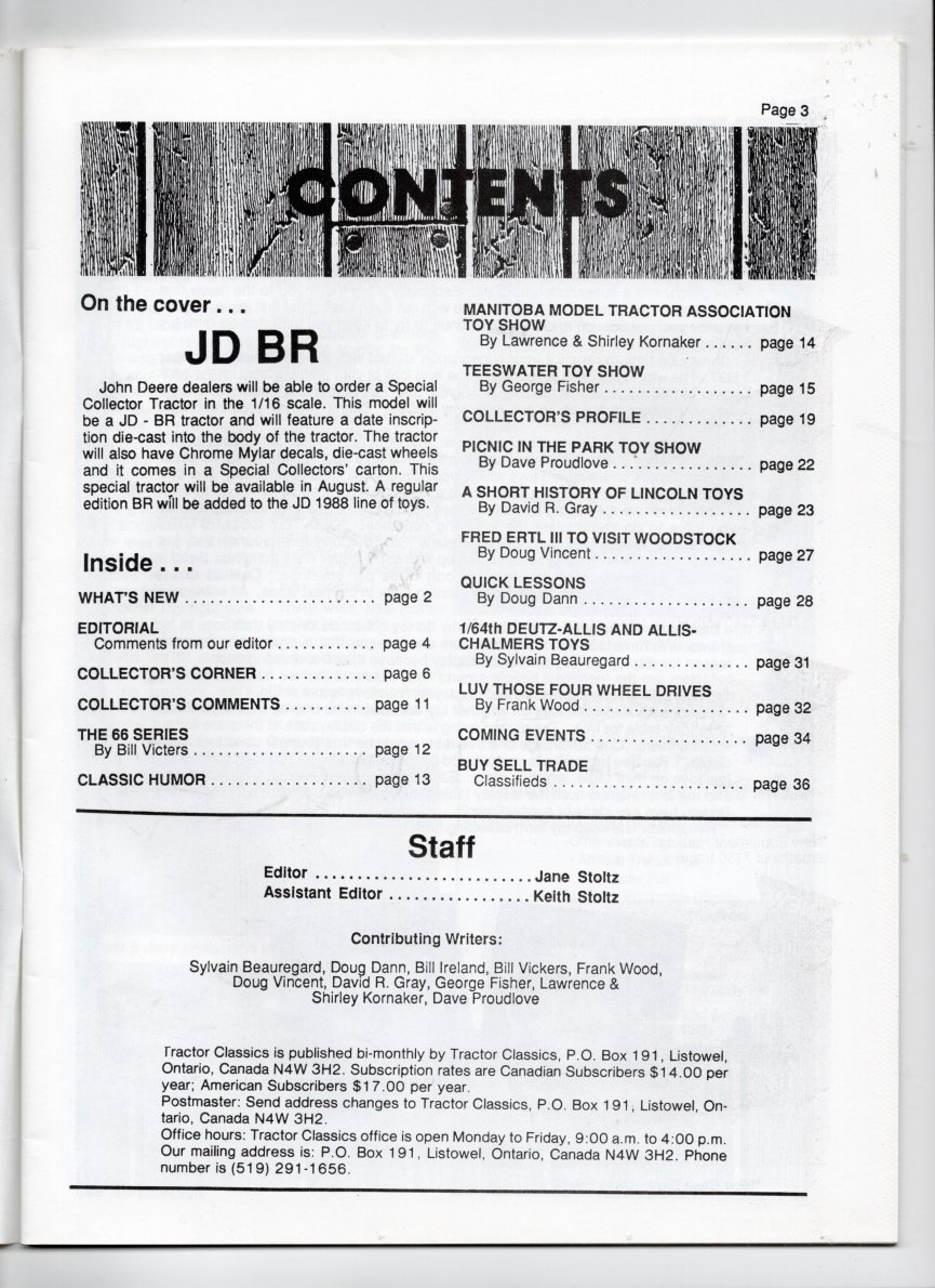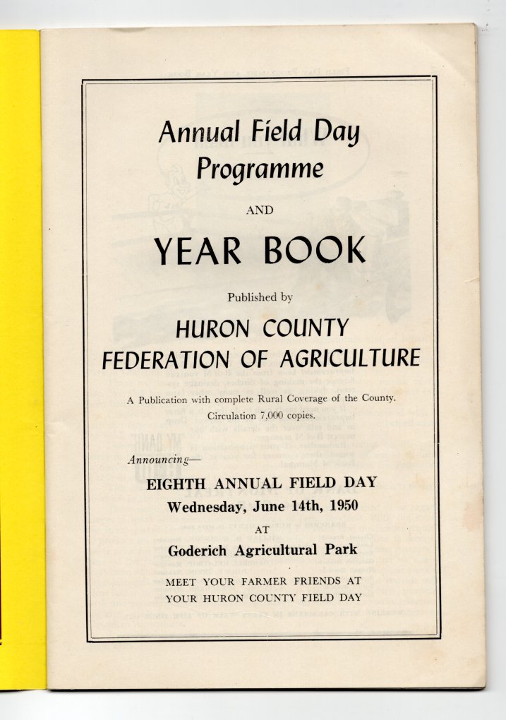 36 pages.Magazine, size is 8" x 11".Collector toy magazine published in Canada devoted to the farm tractor.01809View Full Details - HURON COUNTY YEAR BOOK 1950 (Cover Title) ANNUAL FIELD DAY PROGRAMME AND YEAR BOOK No place Huron County Federation of Agriculture 195065.00Condition for this softcover book is very good with slight edge wear, some wear to spine ends and corners, slight curl to the top and bottom right corner.