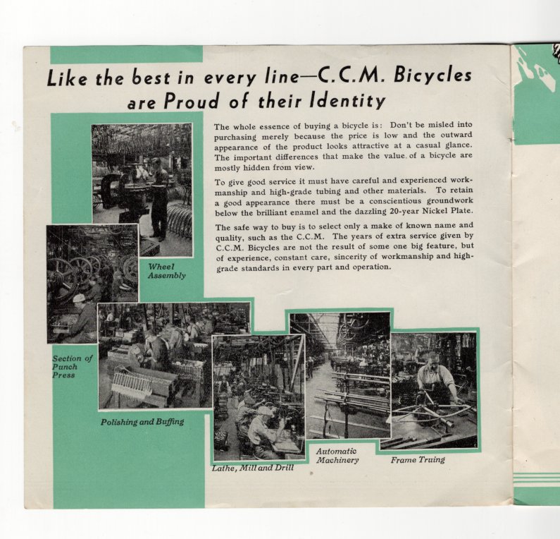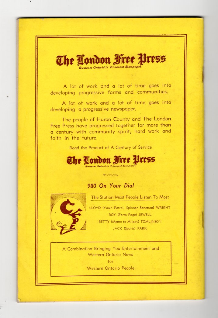 64 pages with photos.Staple-bound wrappers, size is 6" x 9".Program and year book from the 1950 Huron County, Ontario, Canada Field Day. Includes a bit of history of Goderich and surrounding area, event information, with many local area ads.01793View Full Details - CCM BICYCLES 1933 (Original 1933 CCM Sales Booklet) Weston, ON Canada Cycle & Motor Co., Limited 1933175.00Condition for this booklet is very good+ with slight wear to corners, slight edge wear, very small stain base of spine front and back covers.