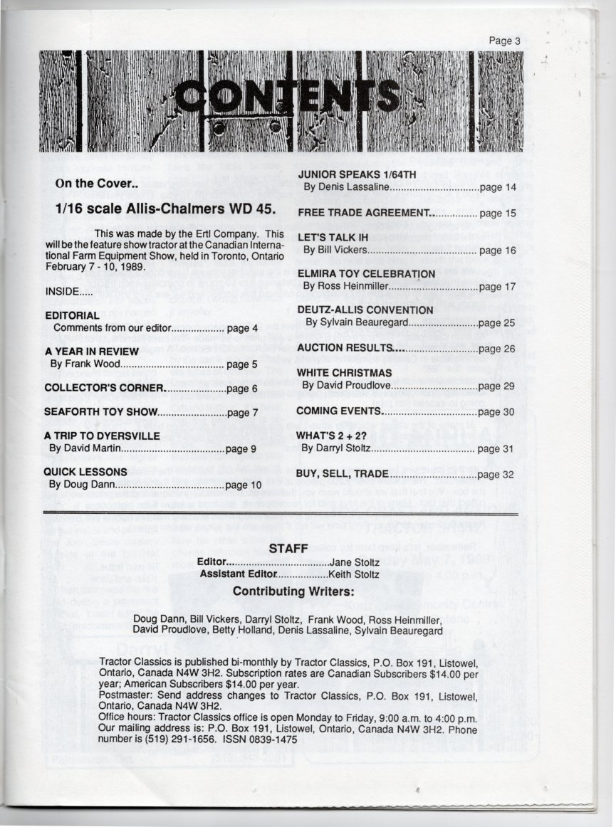 64 pages with illustrations.Staple-bound book, size is 5" x 7 1/2".Sales book from the Geo. H. Lee Company on their products, a way "of handling chickens and hogs for success and profit.".01799View Full Details - TRACTOR CLASSICS VOLUME 2 - NUMBER 3 February 1989 Listowel, ON Tractor Classics 198925.00Condition for this magazine is very good+ with slight scuffing to the front cover, some edge wear, slight wear to corners and spine ends.