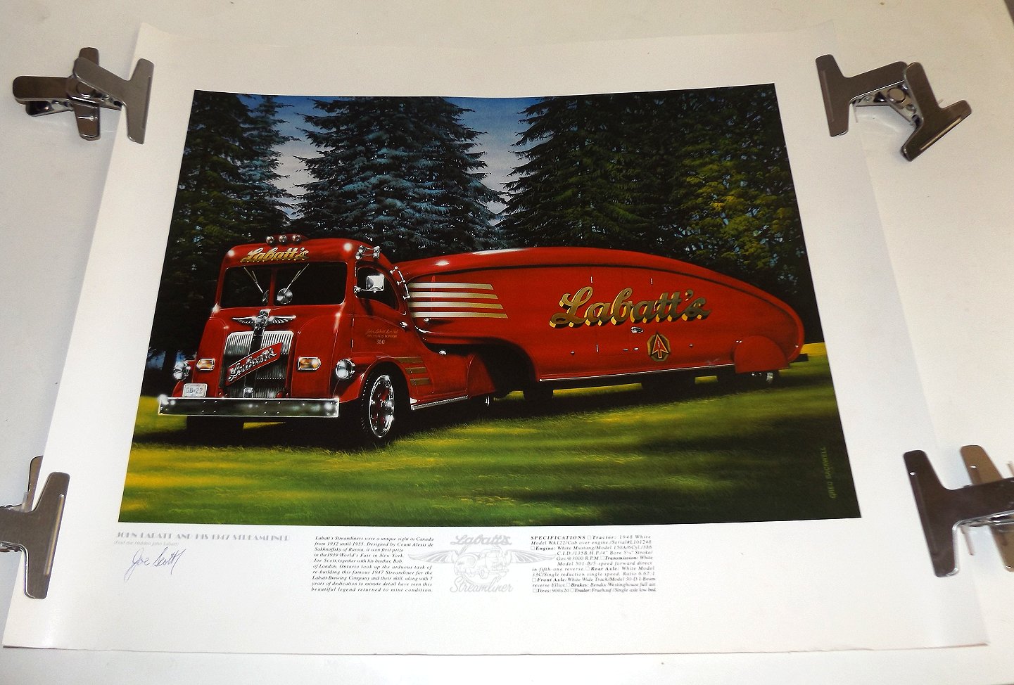 Not the limited edition print signed by the artist and Joe Scott, but an unnumbered copy signed by Joe Scott only. - (GREG BACKWELL PRINT). JOHN LABATT AND HIS 1919 KEG TRUCK PRINT. SIGNED BY JOE SCOTT (Restorer of the Truck). No place no publisher75.00Signed by Joe Scott, who along with his brother restored the truck.Condition is near fine with a bit of edge wear, slight wear to corners.Thick paper stock, size is 22” x 18 ½”, printed on one side.Restored in 1978, before the above 1947 Streamliner, by Joe Scott and his brother Bob, this illustration by Greg Backwell is quite well rendered with details, colours, and hidden somewhere a portrait of John Labatt.01820View Full Details
