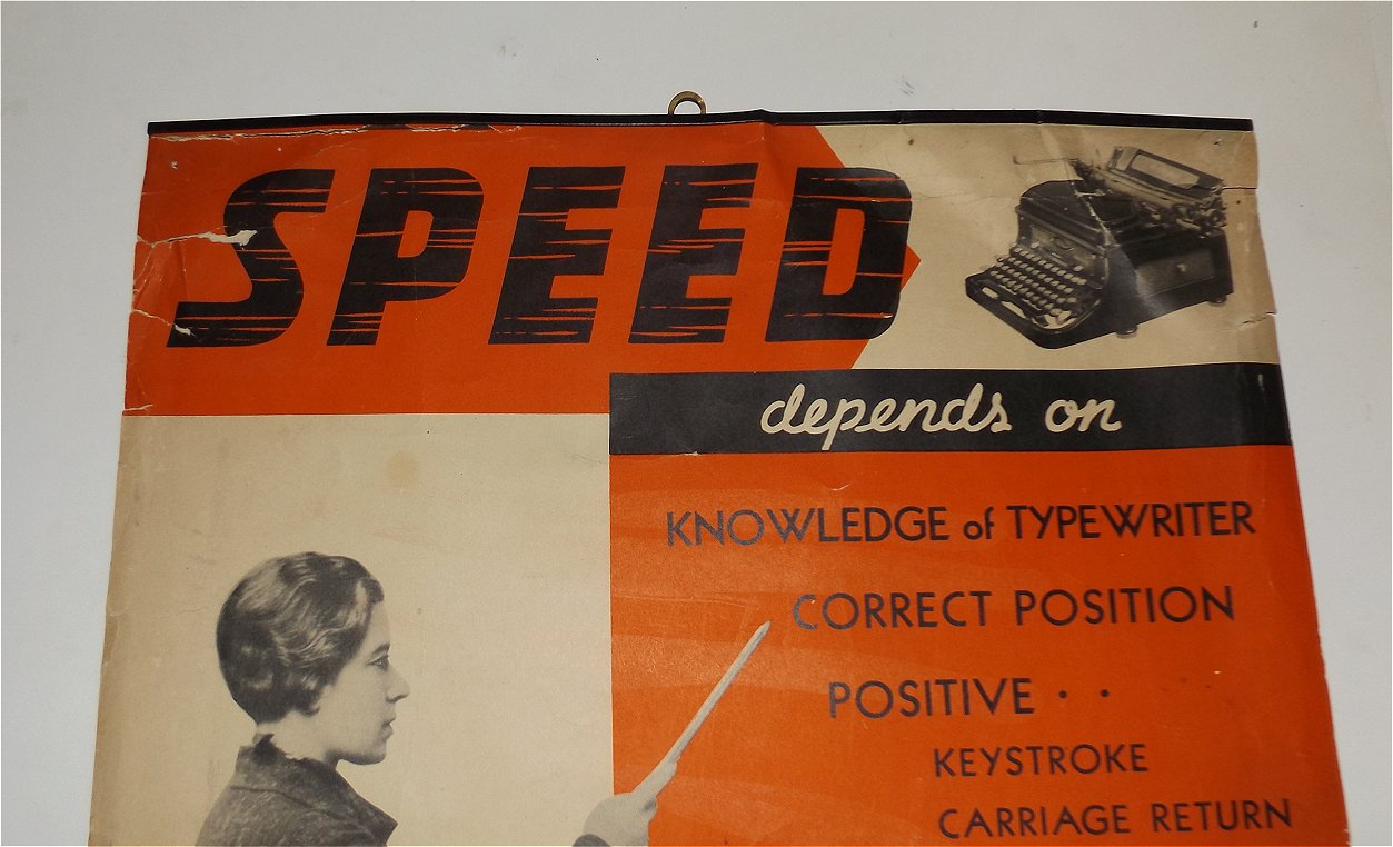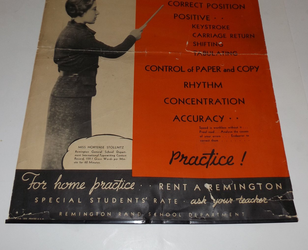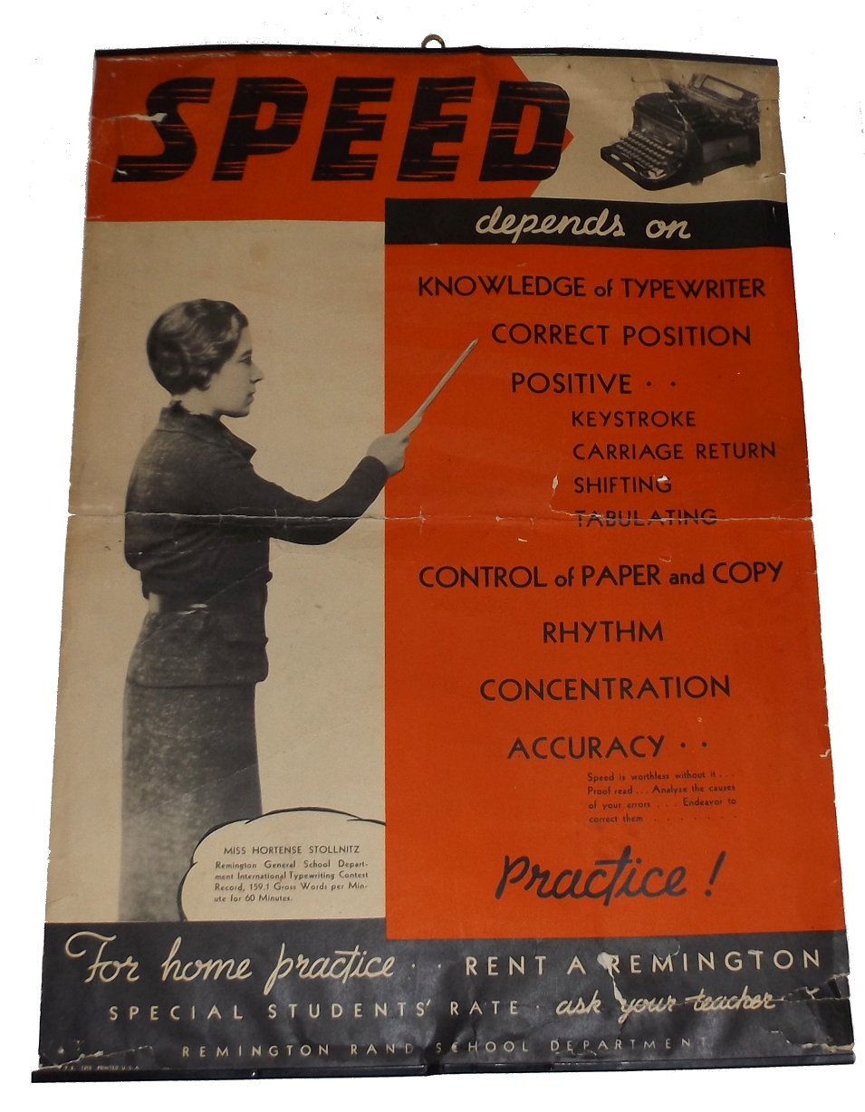 Poster will be shipped rolled. - SPEED DEPENDS ON KNOWLEDGE OF TYPEWRITER... FOR HOME PRACTICE... RENT A REMINGTON...REMINGTON RAND SCHOOL DEPARTMENT. (Original Poster - Late 1920s to Early 1930s) (USA) Remington Rand School Department no date (ca. 1920-30s)175.00Poster size is 14” x 20", thin card stock, printed on one side with thin metal rods affixed across the top and bottom poster (as issued). Condition is good only with creasing, soiling, poster detached from the top metal rod along the left side for about 5”, some short tears along the side, soiling and a few tape repairs to the back. Although not in the best condition, this is a nice example of a scarce early promotional poster.Poster size is 14” x 20", thin card stock.The poster features Hortense Stollnitz, born in 1897 she took up typing in 1914 to prepare for a journalism course at Columbia. By 1917 she was acclaimed as one of the fastest and accurate typists in America. In a 1917 contest she typed 159 words per minute for over one hour on a Remington 10 model typewriter. Shortly after she began working for Remington traveling the U.S. giving demonstrations, a lot of times in schools, probably where this poster originated.01833View Full Details