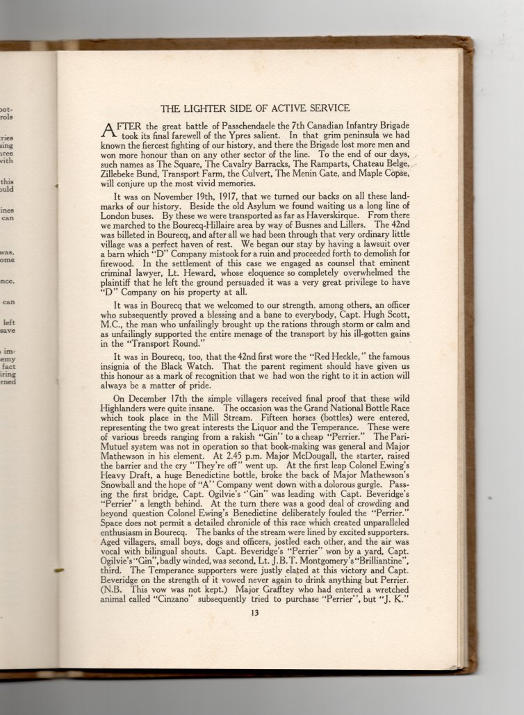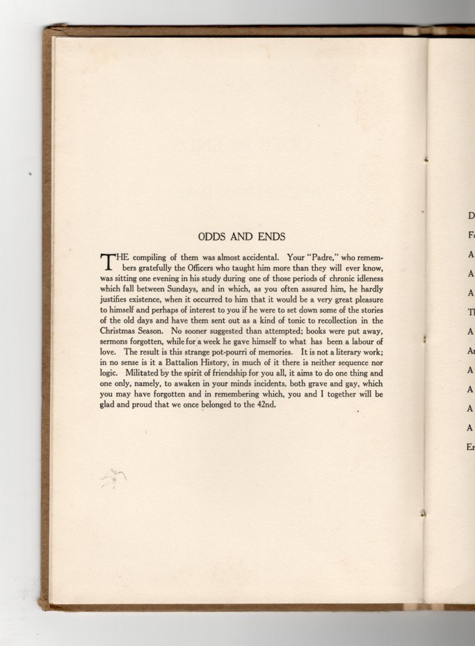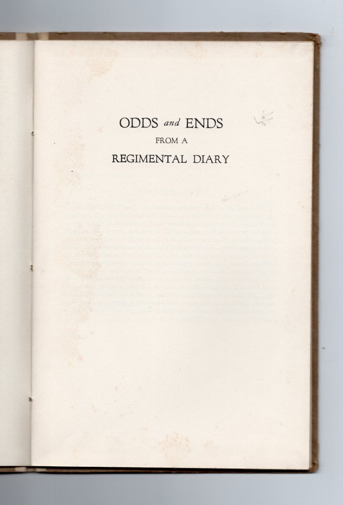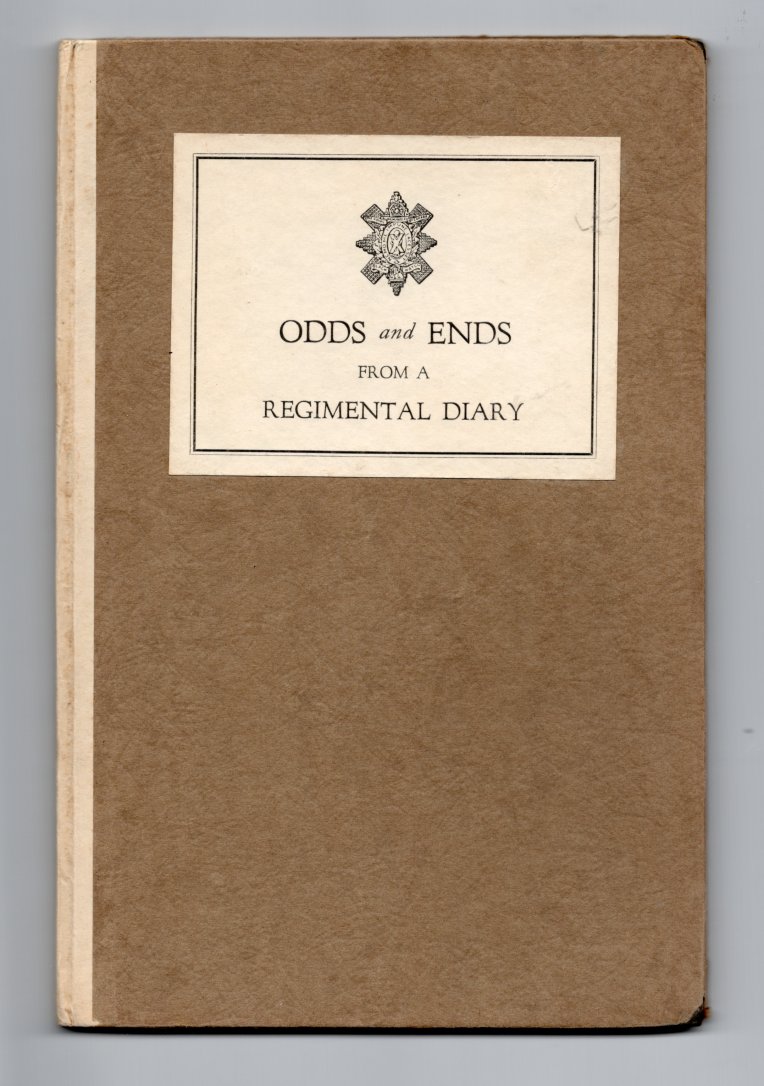 (49) pages with photos.Softcover staple-bound book, size is 5 1/2" x 8".Not only a church history, but also a local history of Foldens, Ontario, Canada. Published to commemorate the original little frame church which at time of publication (1911) was being replaced.01790View Full Details - ODDS AND ENDS FROM A REGIMENTAL DIARY No place no publisher no date (ca 1918-22)185.00Condition is near fine with a touch of wear to the corners and spine ends.