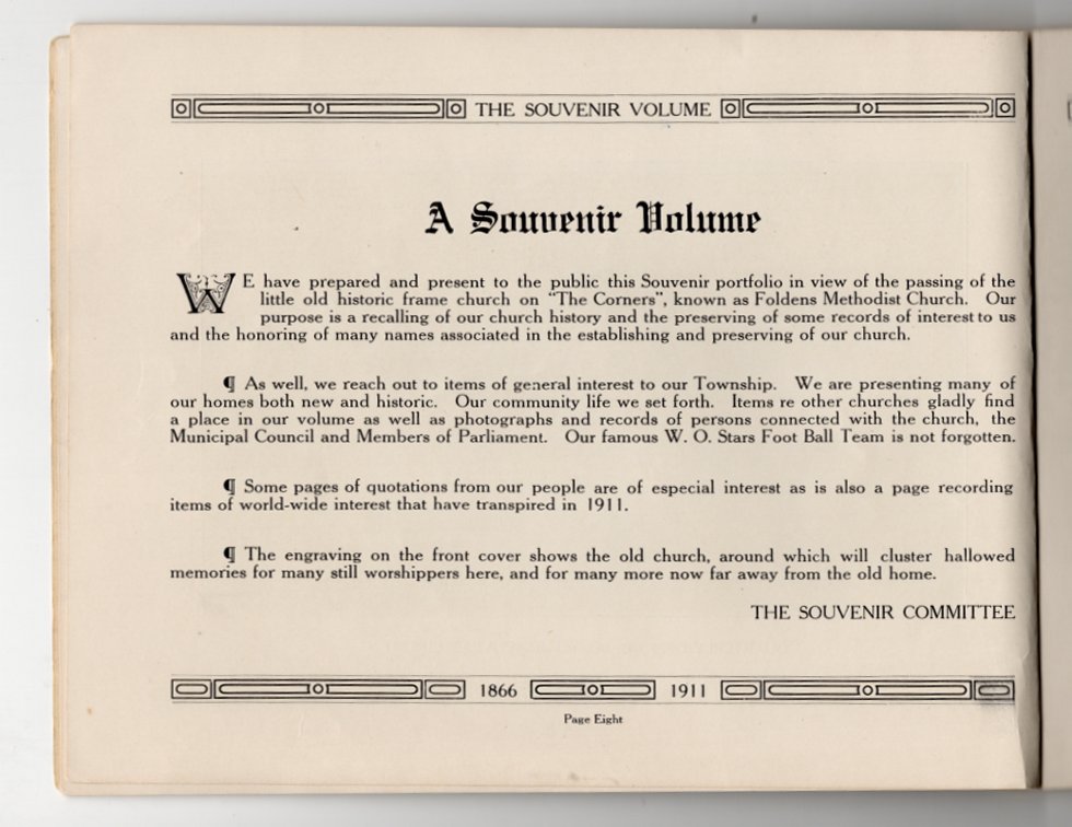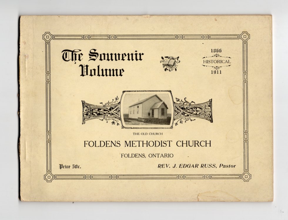 A one-of-a-kind signed program! - THE SOUVENIR VOLUME HISTORICAL AND DESCRIPTIVE 1866 - FOLDENS METHODIST CHURCH - 1911 No place no publisher 191185.00Condition for this softcover book is good+ with most of the spine worn away (see photo), a couple small tears along the edges of the front cover, some smudging to covers, slight edge wear, interior clean.