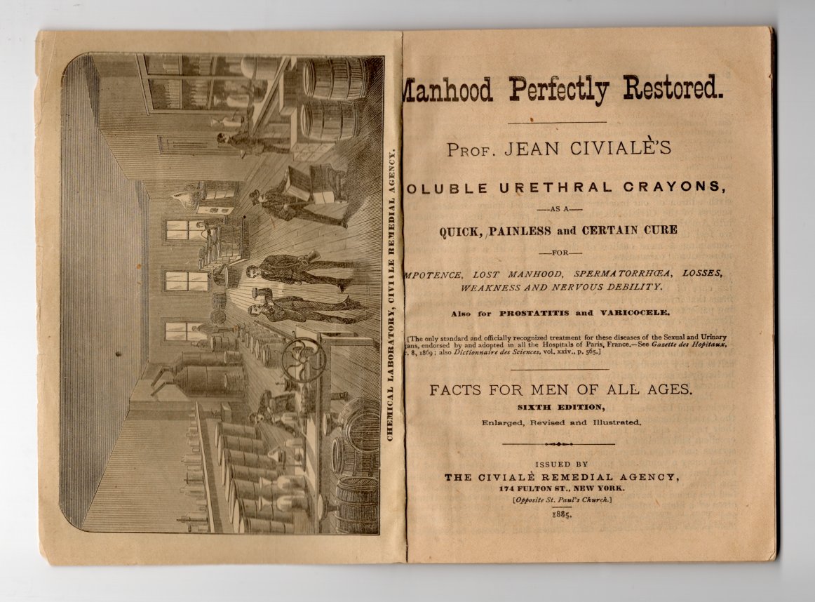 96 pages with illustrations throughout.Softcover, size is 9” x 11 ½”.More than just a catalogue there are sections on the life and times of the inventor of the incubator and numerous full-page articles on farm life, fake chicken literature, advertising, when to sell, raising chicken and much, much more. A fascinating catalogue.01796View Full Details - MANHOOD PERFECTLY RESTORED. PROF. JEAN CIVIALE'S SOLUBALE URETHRAL CRAYONS, AS A QUICK, PAINLESS AND CERTAIN CURE FOR IMPOTENCE, LOST MANHOOD, SPERMATTORRHOEA, LOSSES, WEAKNESS AND NERVOUS DEBILITY. ALSO FOR PROSTATITIS AND VARICOCELE New York The Civiale Remedial Agency 1885200.00"Sixth Edition, Enlarged, Revised and Illustrated."Condition is about very good with some edge wear, some wear to corners, light soiling to wrappers.