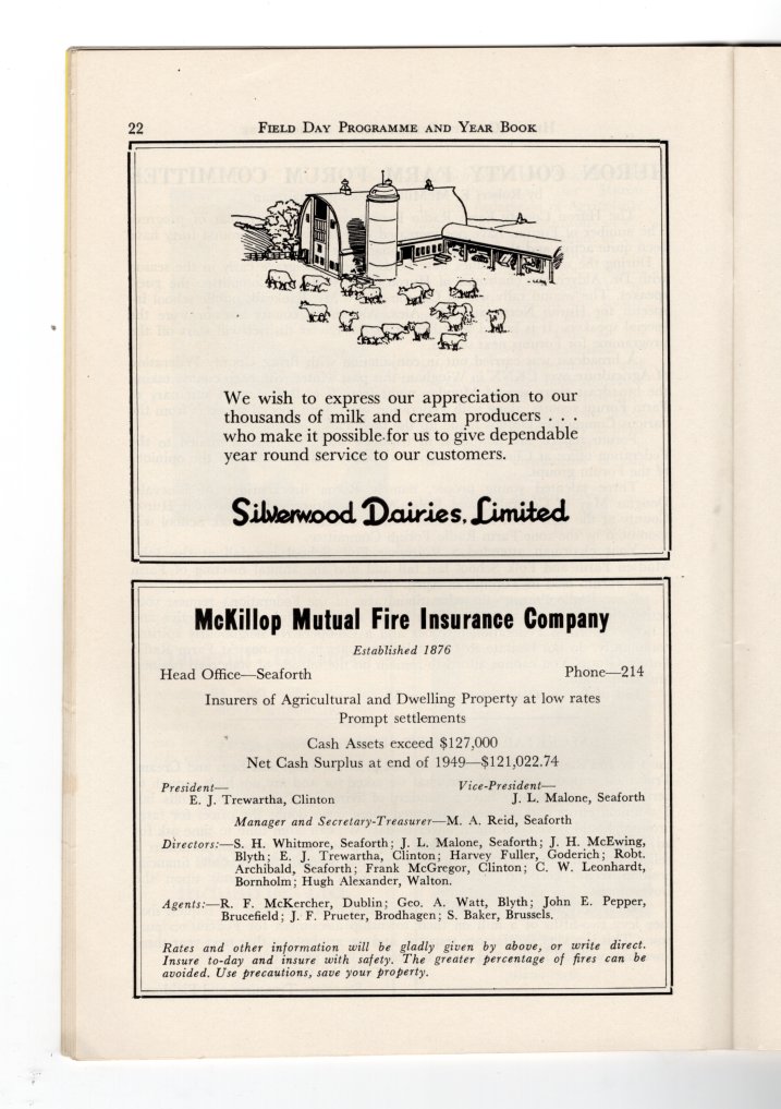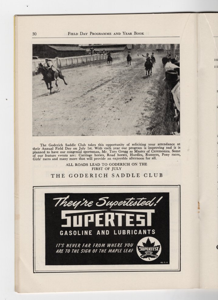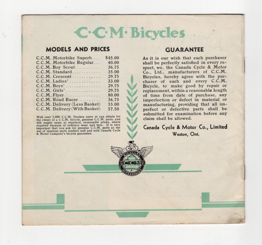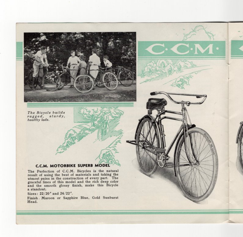 64 pages with photos.Staple-bound wrappers, size is 6" x 9".Program and year book from the 1950 Huron County, Ontario, Canada Field Day. Includes a bit of history of Goderich and surrounding area, event information, with many local area ads.01793View Full Details - CCM BICYCLES 1933 (Original 1933 CCM Sales Booklet) Weston, ON Canada Cycle & Motor Co., Limited 1933175.00Condition for this booklet is very good+ with slight wear to corners, slight edge wear, very small stain base of spine front and back covers.