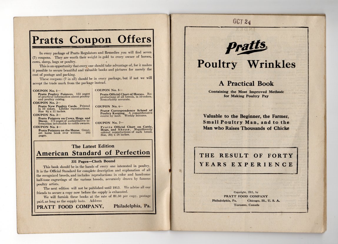 - PRATTS POULTRY WRINKLES A PRACTICAL BOOK EDITION OF 1911 Philadelphia, Chicago, Toronto Pratt Food Company 191175.00Condition for this softcover book is very good+ with slight edge wear, slight wear to corners, some wear to spine ends, light crease to front and back covers.