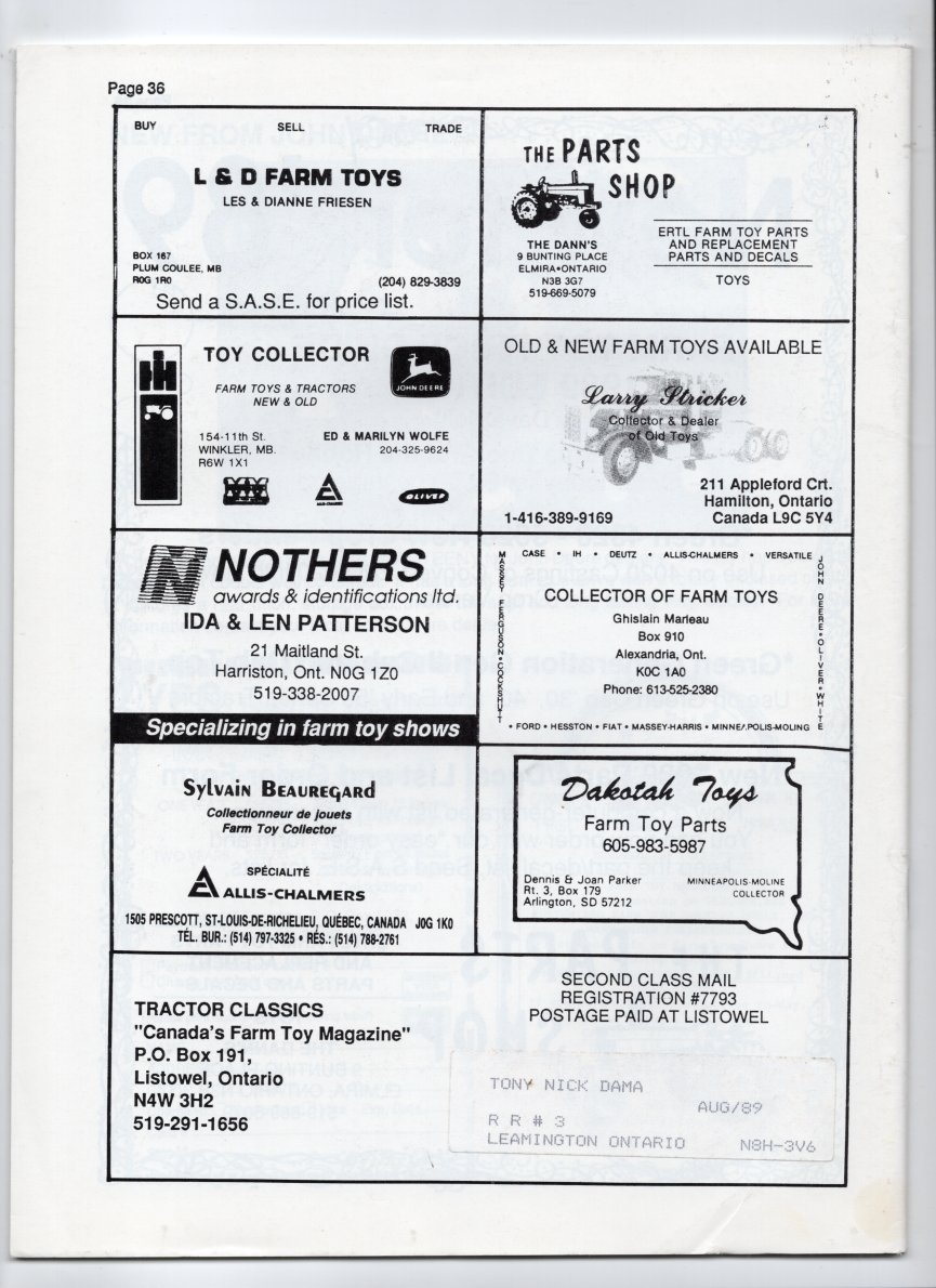 36 pages.Magazine, size is 8" x 11".Collector toy magazine published in Canada devoted to the farm tractor.01809View Full Details - HURON COUNTY YEAR BOOK 1950 (Cover Title) ANNUAL FIELD DAY PROGRAMME AND YEAR BOOK No place Huron County Federation of Agriculture 195065.00Condition for this softcover book is very good with slight edge wear, some wear to spine ends and corners, slight curl to the top and bottom right corner.