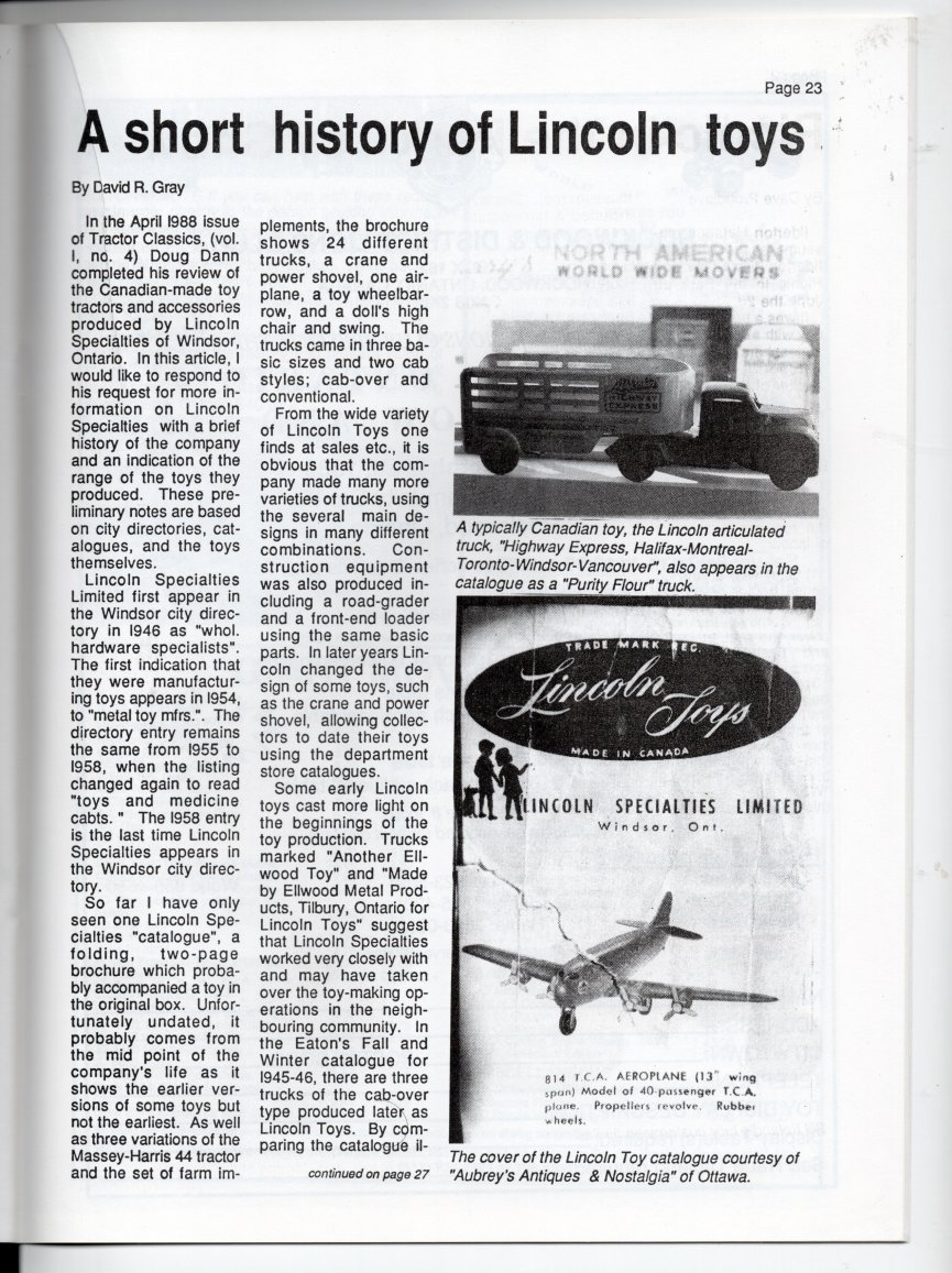 36 pages.Magazine with paper covers, size is 8" x 11".Collector toy magazine published in Canada devoted to the farm tractor.01810View Full Details - (GREG BACKWELL PRINT). JOHN LABATT AND HIS 1947 STREAMLINER POSTER. SIGNED BY JOE SCOTT (Restorer of the Truck). No place no publisher no date (circa late 1980100.00Signed by Joe Scott, who along with his brother restored the truck. Condition is near fine with a bit of edge wear, slight wear to corners. Thick paper stock, size is 22” x 18 ½”, printed on one side.The Streamliner was restored in 1983 by Joe Scott and his brother Bob, this illustration by Greg Backwell is quite well rendered with details, colours, and a hidden portrait of John Labatt. With a brief history of the restoration and the truck specifications printed on the bottom.01819View Full Details