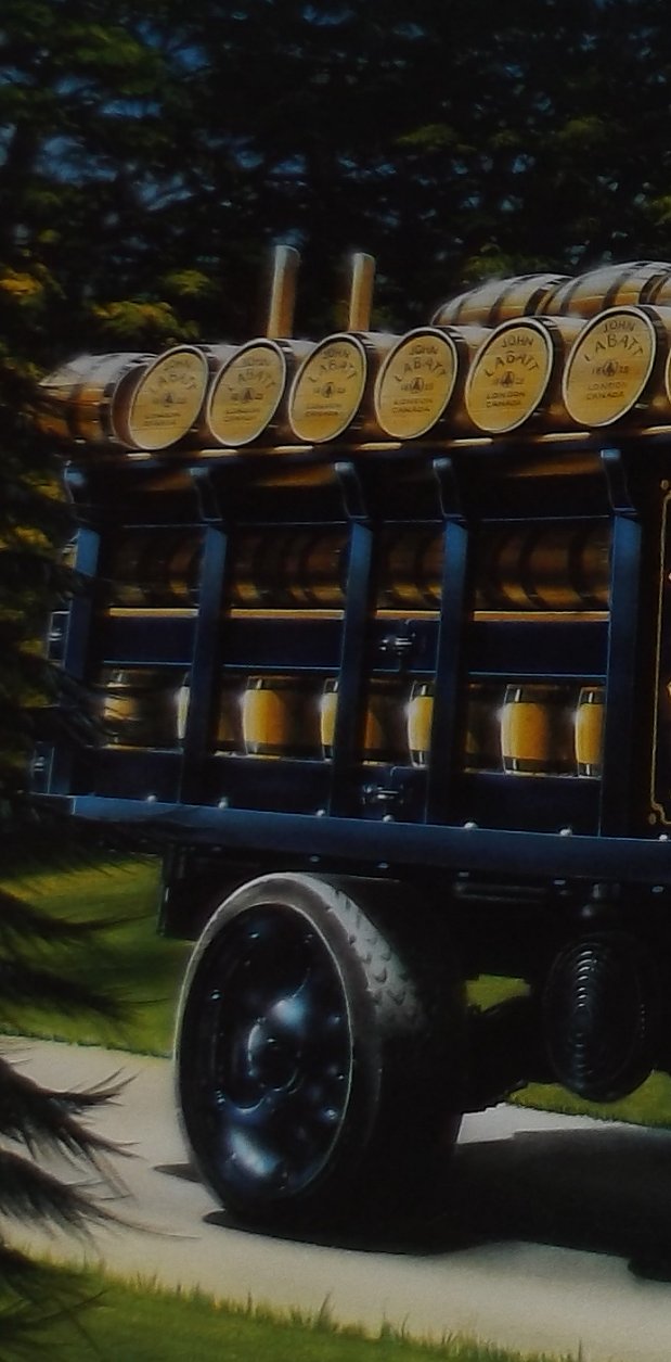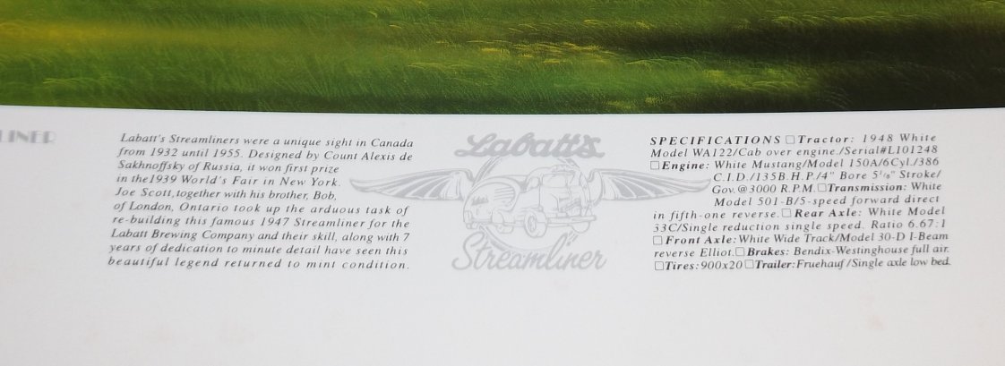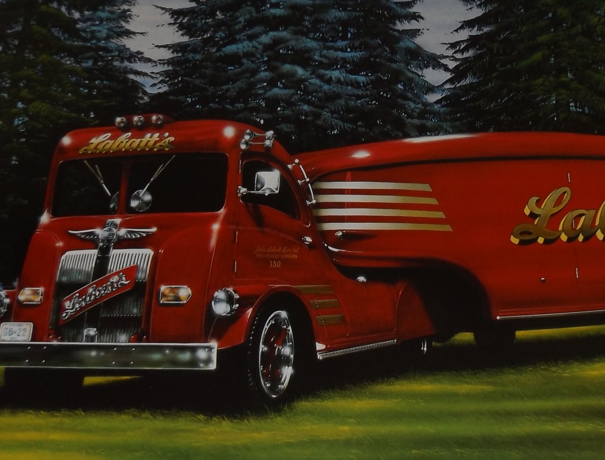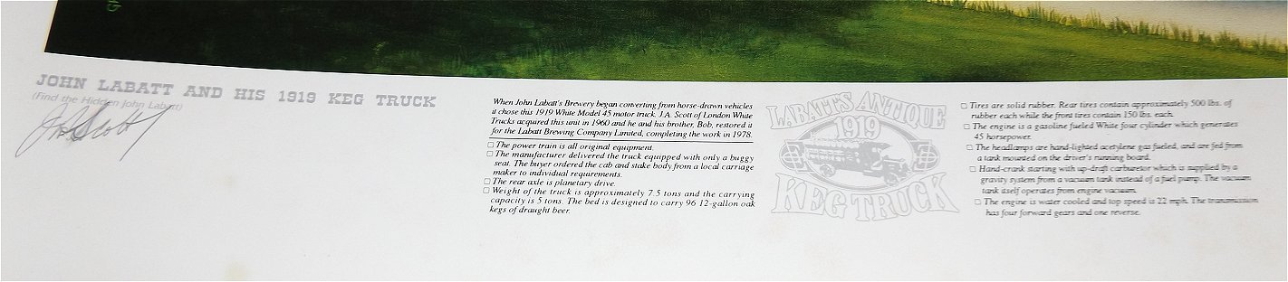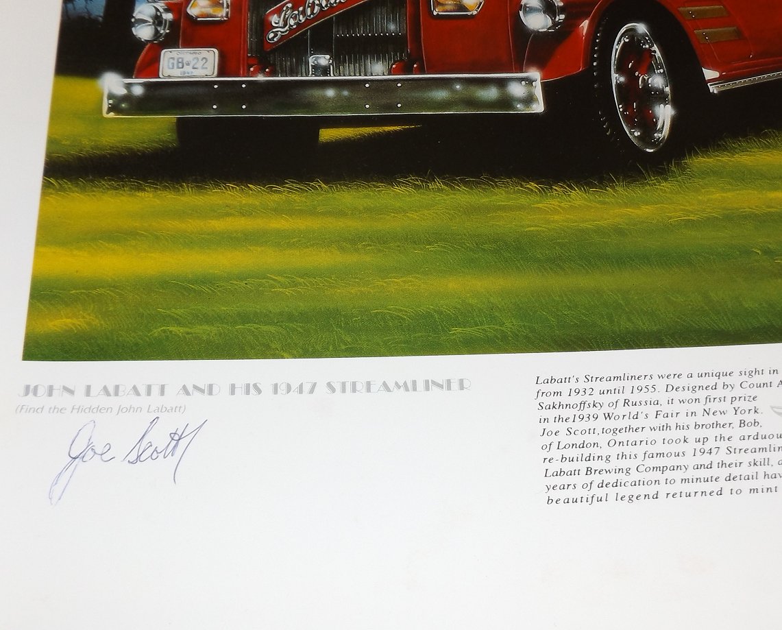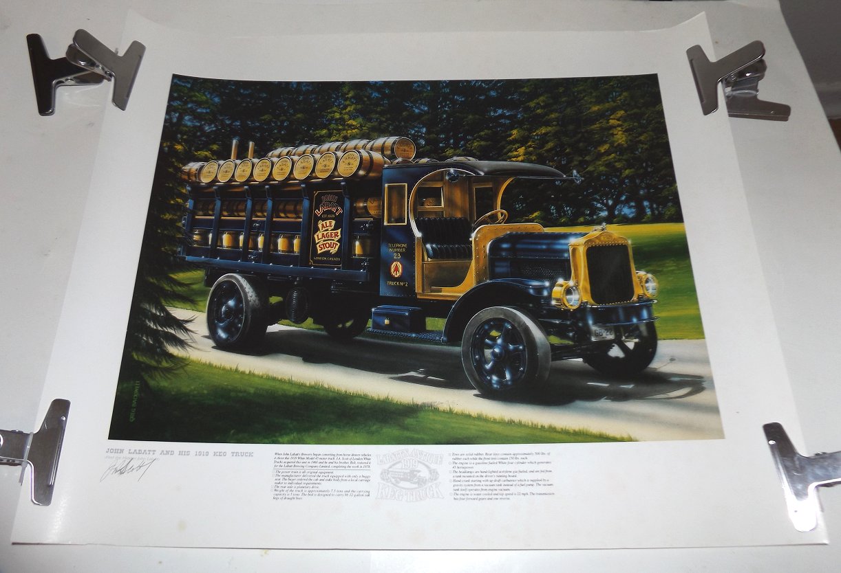 Not the limited edition print signed by the artist and Joe Scott, but an unnumbered copy signed by Joe Scott only. - (GREG BACKWELL PRINT). JOHN LABATT AND HIS 1919 KEG TRUCK PRINT. SIGNED BY JOE SCOTT (Restorer of the Truck). No place no publisher75.00Signed by Joe Scott, who along with his brother restored the truck.Condition is near fine with a bit of edge wear, slight wear to corners.Thick paper stock, size is 22” x 18 ½”, printed on one side.Restored in 1978, before the above 1947 Streamliner, by Joe Scott and his brother Bob, this illustration by Greg Backwell is quite well rendered with details, colours, and hidden somewhere a portrait of John Labatt.01820View Full Details