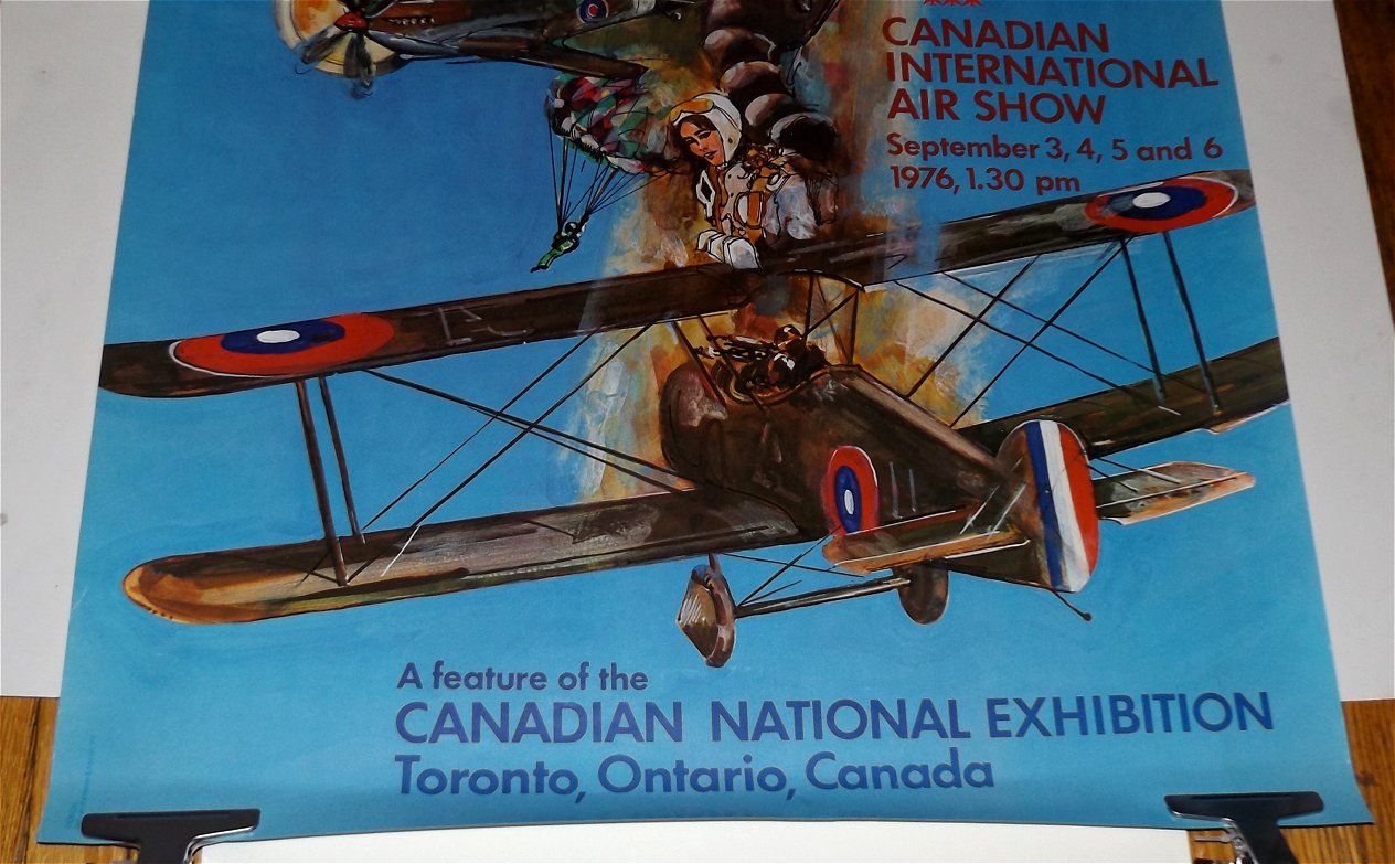 Print will be shipped rolled. - CANADIAN INTERNATIONAL AIR SHOW … 1976. A FEATURE OF THE CANADIAN NATIONAL EXHIBITION TORONTO, ONTARIO, CANADA. (Original Poster) No place no publisher 1976100.00Condition for this poster is better than very good but not quite near fine, with a bit of wear and small tears and a very small chip to the poster’s top left corner. Size is 24” x 36”, poster printed on one side.Original poster for the 1976 Canadian International Air Show held during the Canadian National Exhibition.01821View Full Details