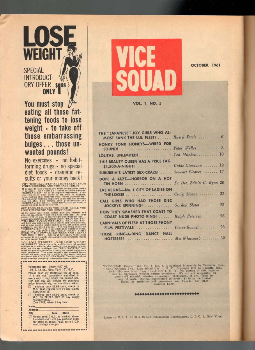 66 pages with photos.Magazine, size is 8 1/2" x 11".Scandal / crime magazine from the early 1960s with stories on Las Vegas "ladies on the loose"; Jazz and Dope; Dance Hall Hostesse, and more.01832View Full Details